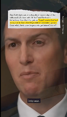 "well known in youtube .. Kushner started this iran war on behalf of Israel .. Kushner funded an israeli insurance company with $2 billion of Saudi money .. eventually all of this surfaces sooner or later .. " - mkt repos